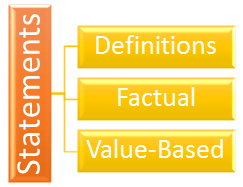 There are three types of statements, definitions, factual, and value-based ones. A definition is a statement that is a definition in itself or that is derived from a definition and could be “2+2=4.″ A factual statement is derived from an observation and could be that “the clouds are gray.” A value-based one is a normative statement that asserts what is right or good, such as, “you are too old to drive.” This course deals mainly with value-based or normative statements.